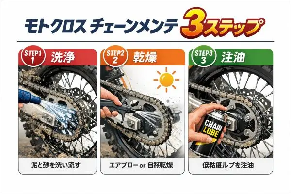 モトクロスを始めたばかりだと、走行のたびに泥だらけになるチェーンの扱いに困る人も多いと思います。