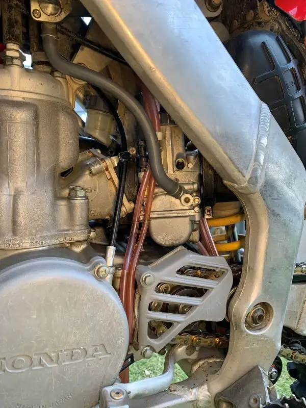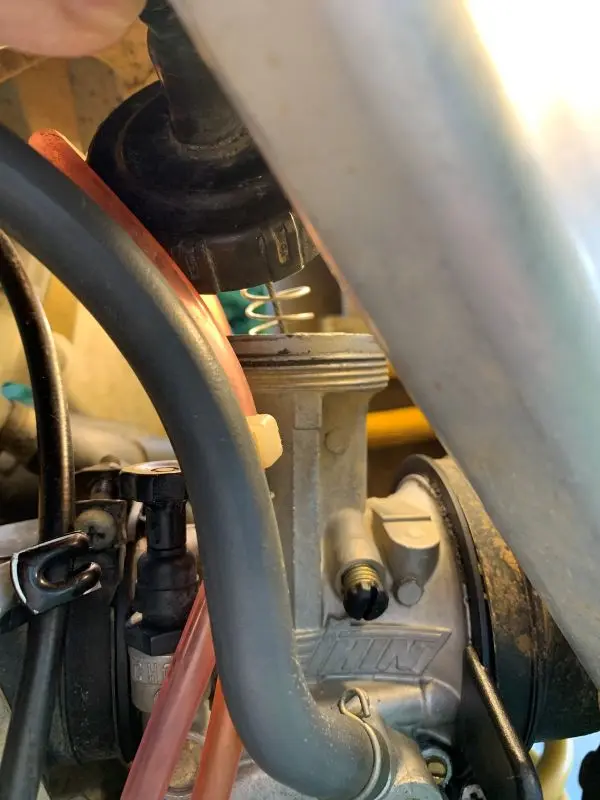 作業時はバイク左側面からキャブを覗き込むように作業を行いますので