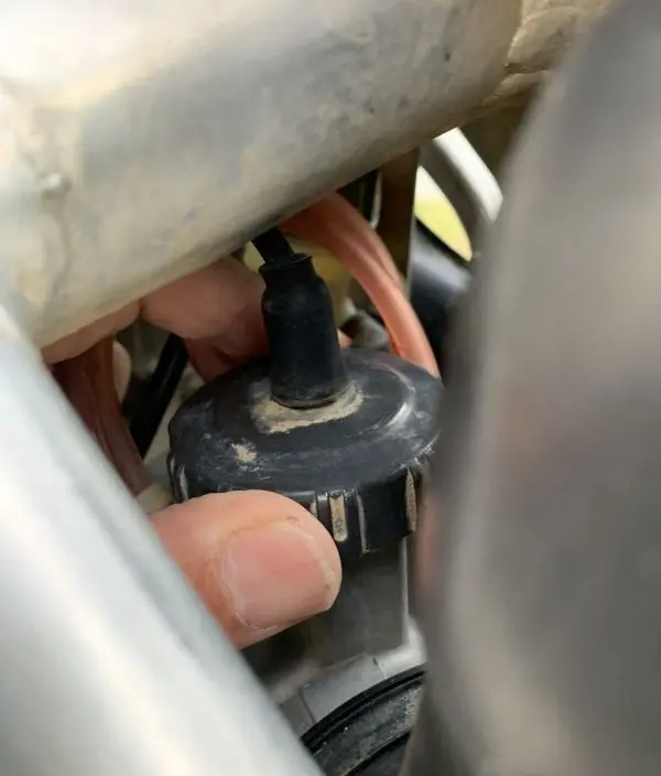 キャブは横向きにしなくても作業可能ですが、念のためガソリンコックをOFFにします。