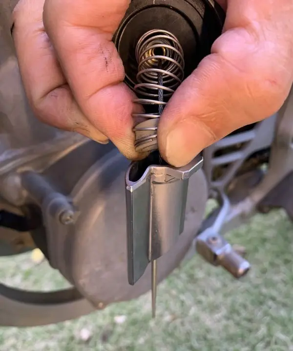 ズルっと左右にぶれないように上からそっと抑えます。写真では分かりやすいようにクリップには指をかけていませんが、できれば指でクリップも押さえながジェットニードルを押し付けます。