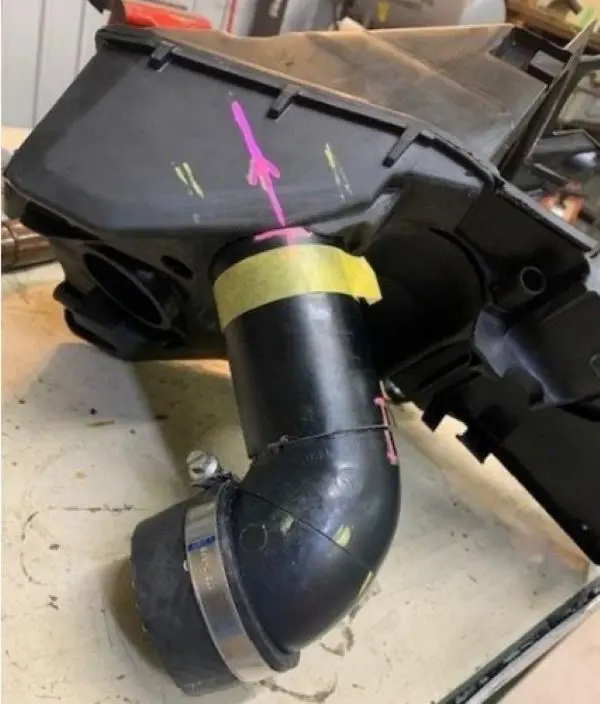 エアクリーナーBOXとキャブとのコネクティングチューブをワンオフでかなり芸術的につくりました。しかしコネクテイングチューブとエアクリーナーBOXまでの通線がこれちょっと細いんです。一般的に2stエンジンのキャブの吸気側ファンネル部はできるだけ最短で大きく開放してあげる必要があるのです。しかし今回製作したものは細くて長い。エアクリーナーBOX部の大容量部までの経路が長いんです。長い細いファンネル付けた状態に近い。原理原則に従えばファンネルが長いと吸気慣性が働くので高回転仕様になる。しかし、DIYでエアクリーナーBOXとその接続部であるコネクテイングチューブをつくろうとすると形状自由度に限界があるのです。