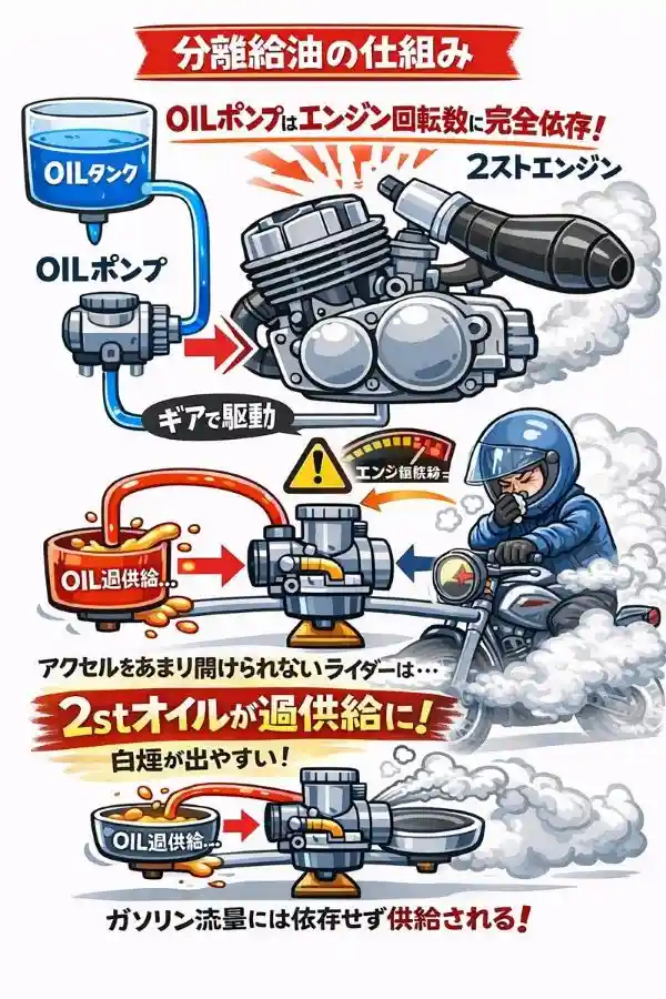 分離給油ユーザーの不満の多くはサイレンサーからのオイル垂れを気にしてのオイル銘柄迷走→ENG不調かと思います。しかし白煙やオイル垂れは分離給油の基本性能と多様な走行モードによるところの影響が大きい部分です。街乗りONLYのユーザーもいれば、自走サーキット走行ユーザーもいます。渋滞路や高速道路な多様なスピードレンジ、多様なアクセル開度、その頻度が多様なため、OILの合わせ込みはサーキットONLYの車両よりも難しいと思われます。