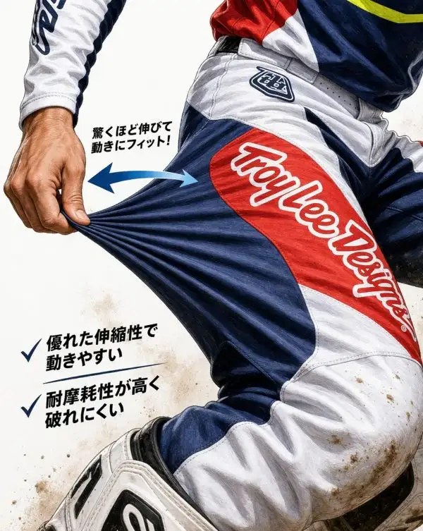 - 膝まわりの強度がありニーブレスによる破れは起きにくい。